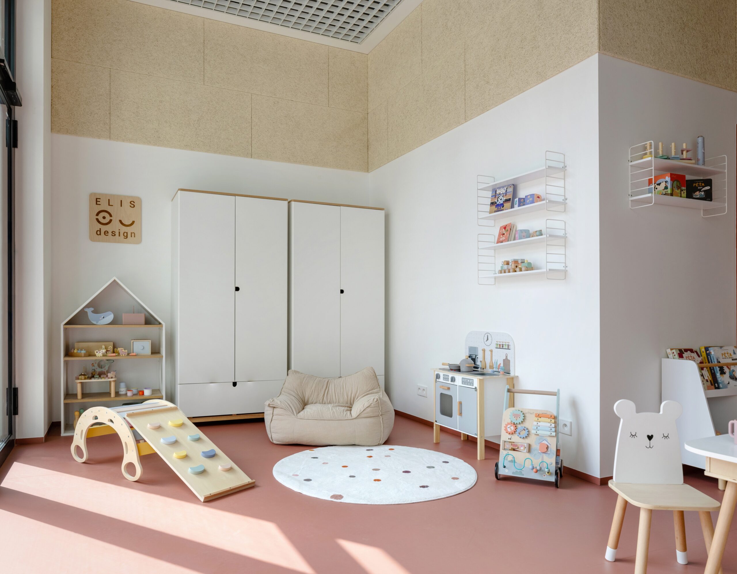 Prostor je vybaven montessori hračkami a nábytkem od Elis Design.